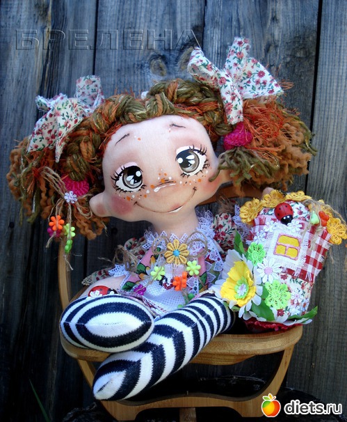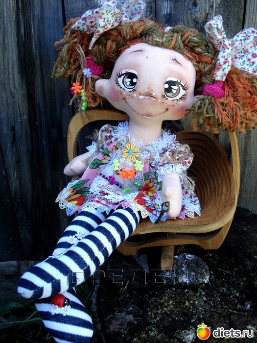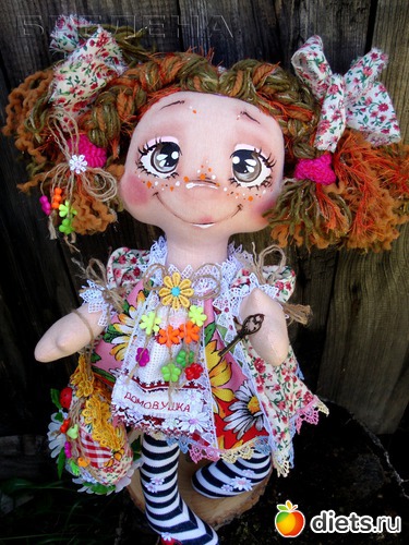 Кукла самостоятельно не стоит, в волосах имеется петелька для крепления на стене. Кукла сшита из фабрично окрашенного натурального льна. В оформлении куклы использованы акриловые краски для ткани.