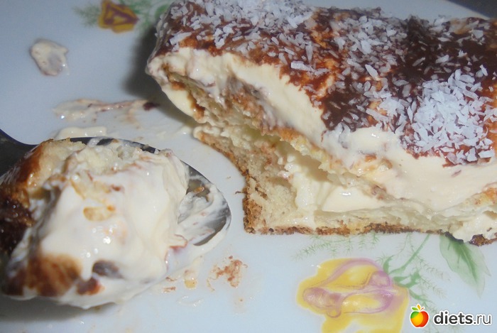 А в силиконовой форме у меня ничего не пригорело. Бисквит поднялся и отдавал кокосом. С кремом не слился, т.к. крем белый, а бисквит с корочкой был. И сверху глазурь придала вкус шоколада.