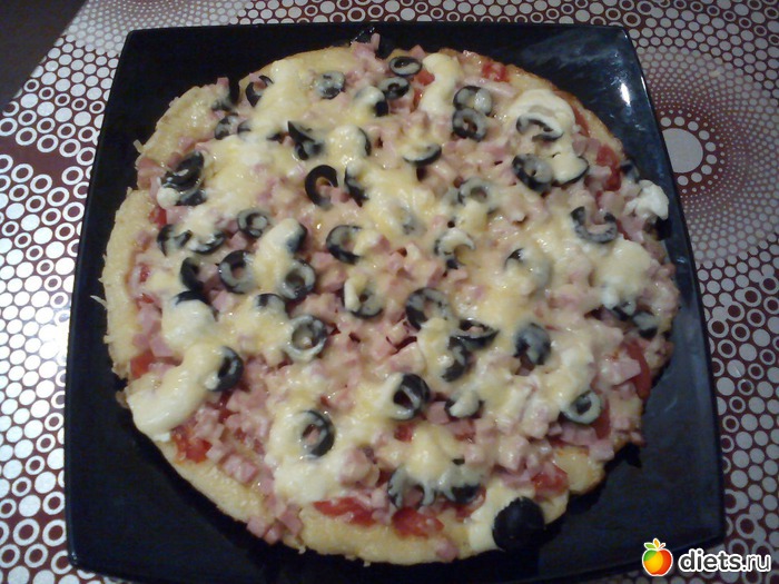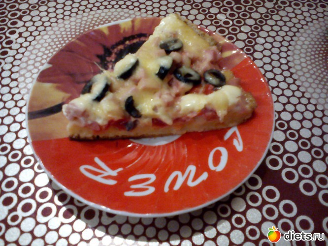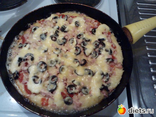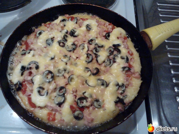 7. Ставим сковородку на небольшой огонь, накрываем крышкой и жарим…или печем нашу пиццу. Когда сыр расплавится, можно считать, что пицца готова.