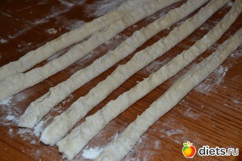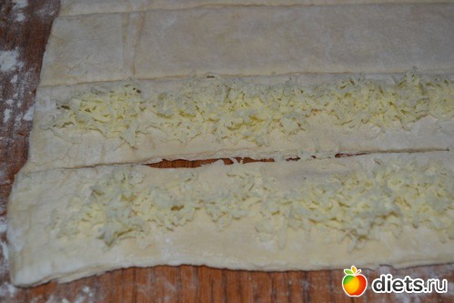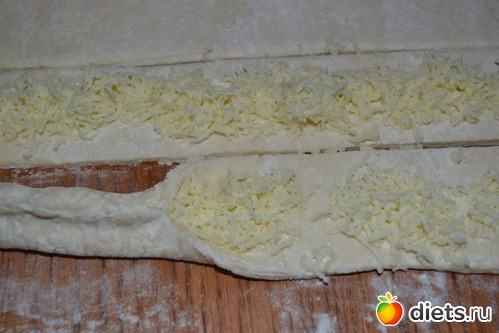 На каждую полосочку теста выкладываем тертый сыр и сворачиваем его в трубочку, делая защипы по всей длине.
