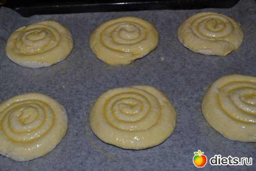Перед формированием улиточки можно слегка сбрызнуть уже начиненные полосочки теста водой – это будет способствовать тому, что при сворачивании изделие будет держаться.