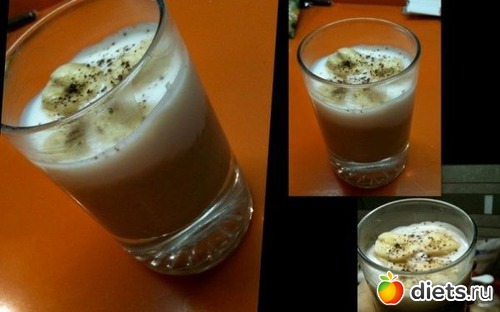 Рис сварить, добавить молока, поварить еще минут 5—10. Все перемолоть в блендере, с бананом можно добавить корицу, изюм, кокосовую стружку, какао, и т.д. Выложить в красивый стеклянный стакан, сверху покрыть йогуртом, и кружочками бананов. Сверху молотый шоколад. Неплохой завтрак или десерт для гостей!