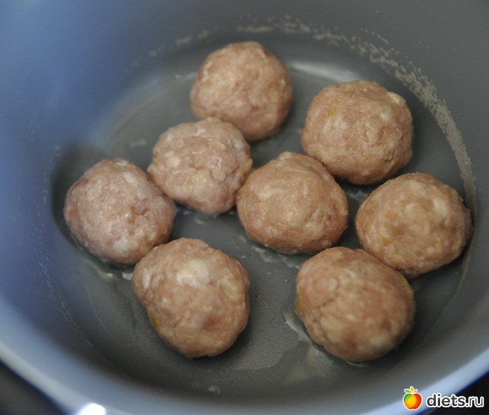 Берём куриный фарш, лучше перекрученный самостоятельно, делаем небольшие фрикадельки. В сотейник наливаем оливковое масло и на сильном огне обжариваем фрикадельки до румяности (катая их по дну сотейника) 1 минуту.