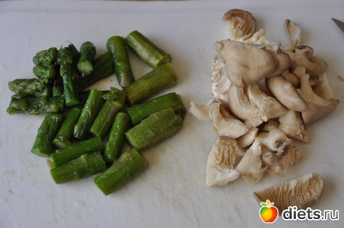 Берём спаржу (у меня мороженная) и промытые грибы (у меня вешенки), режем, кладём к фрикаделькам и обжариваем всё, помешивая 2 минуты.