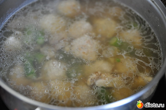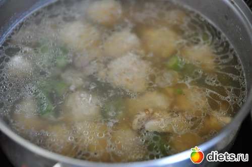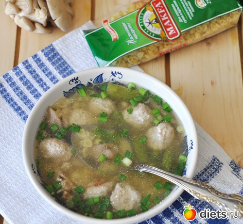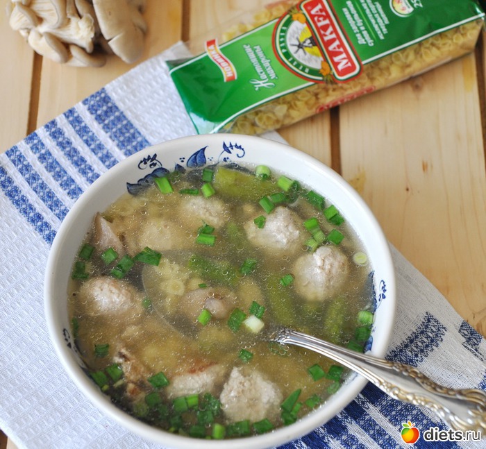 Суп со спаржей, вешенками, фрикадельками и "ракушками"