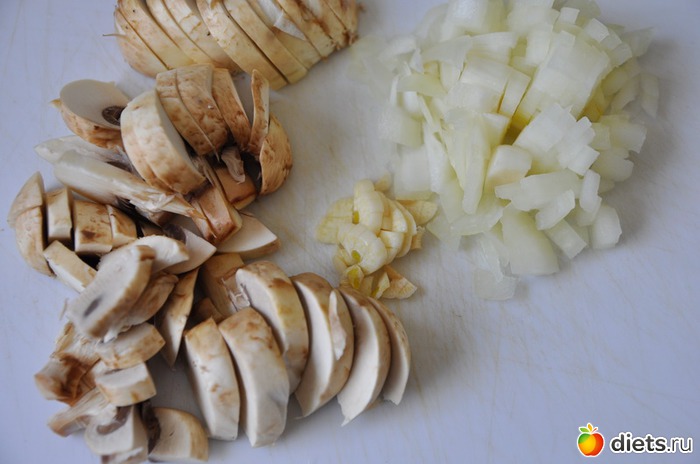 Лук, чеснок и шампиньоны мелко режем.