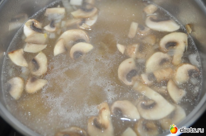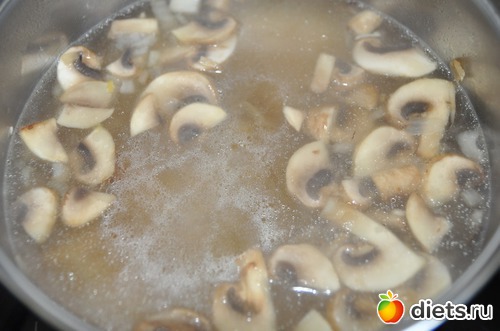 Берём кастрюлю или сотейник, наливаем масло и обжариваем лук, чеснок и грибы пару минут. Заливаем процеженным куриным бульоном.