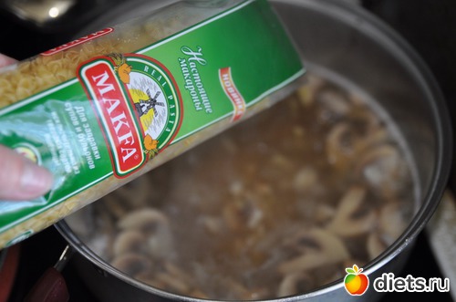 Доводим до кипения, засыпаем макаронные изделия MAKFA (для заправки супов и бульонов), опять доводим до кипения, варим 3 минуты.