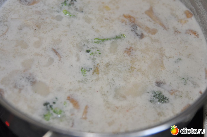 Добавляем брокколи (у меня мороженная), порезанное кубиками отварное куриное филе, сливки, соль, свежемолотую смесь перцев.