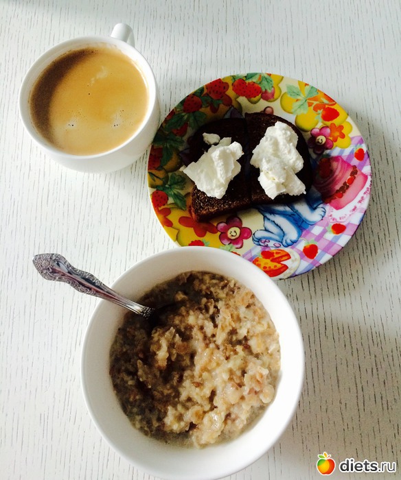 Завтрак: мюсли с соевым молоком и корицей, хлеб с рикоттой, кофе