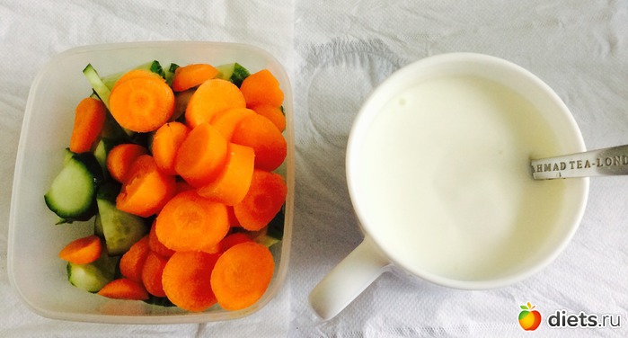 Обед: 2 стакана кефира, огурцы и морковь