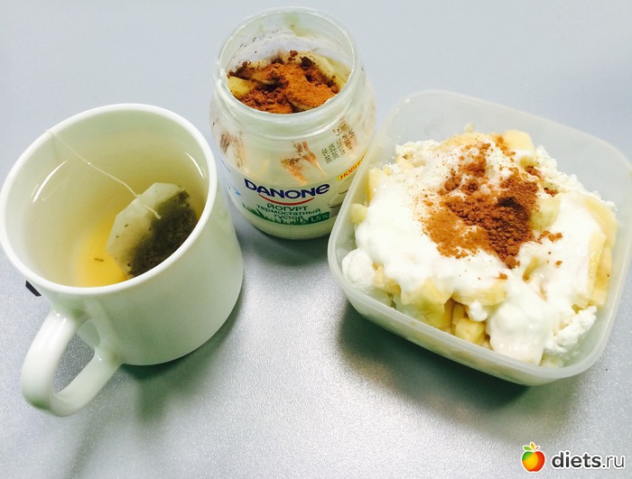 Полдник: творог с йогуртом, бананом и какао, чай