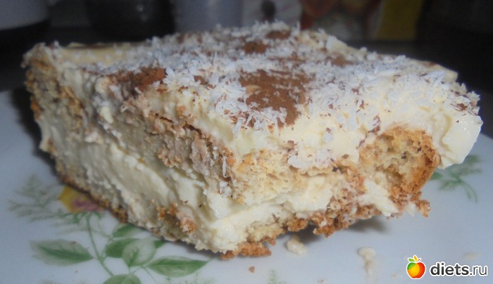 Чуть теплые коржи, верх и бока тщательно промазать кремом и обсыпать какао и кокосовой стружкой (по желанию).