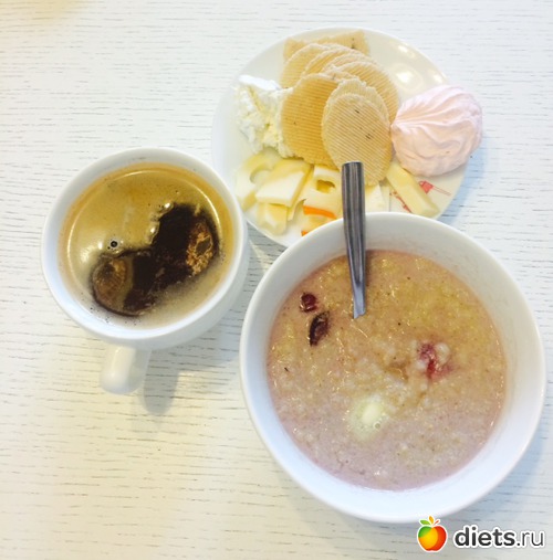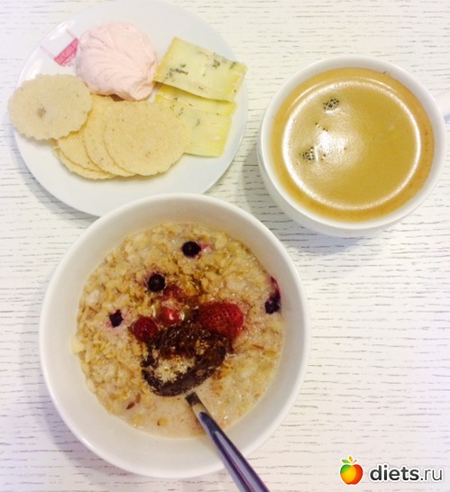 Завтрак: овсянка с соевым молоком, фруктами и корицей, сыр, хлебцы, зефирка, кофе