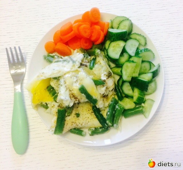 Обед: яичница с зеленой фасолью, огурцы и морковь