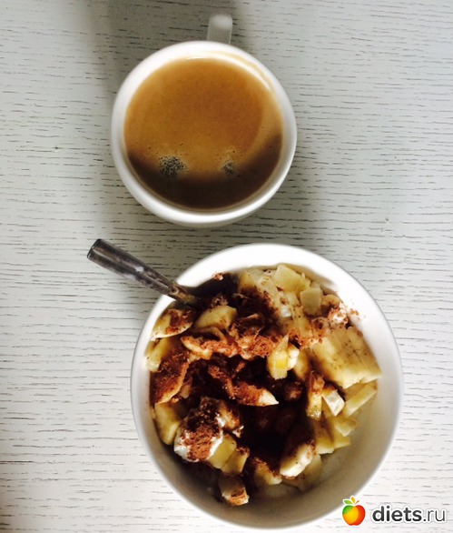 Ланчеобед: творог с йогуртом, бананом и какао, кофе