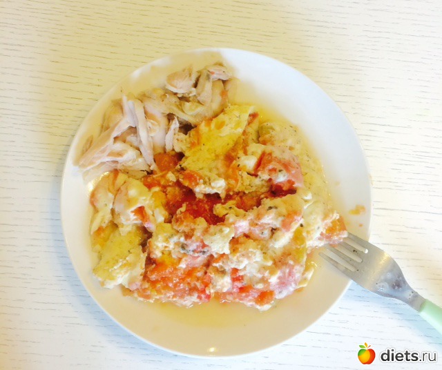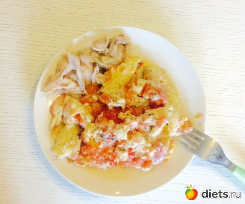 Полдникоужин: яичница с помидором, куриное мясо