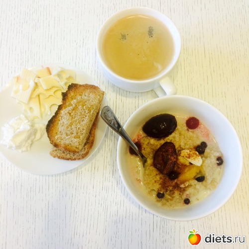 Завтрак: ячневая каша с фруктами и соевым молоком, сыр, хлеб, кофе