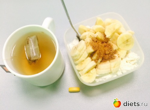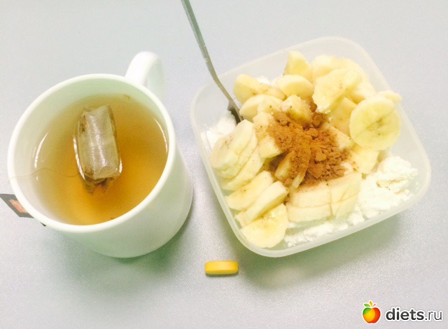 Ланч: творог с бананом и какао, чай, витаминка