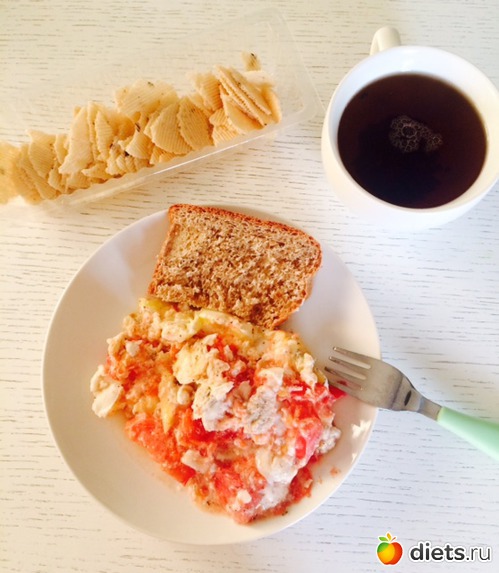 Ужин: яичница с помидором, хлеб, чай с хлебцами (последствия полдника, так сказать...никакого чувства насыщения...)