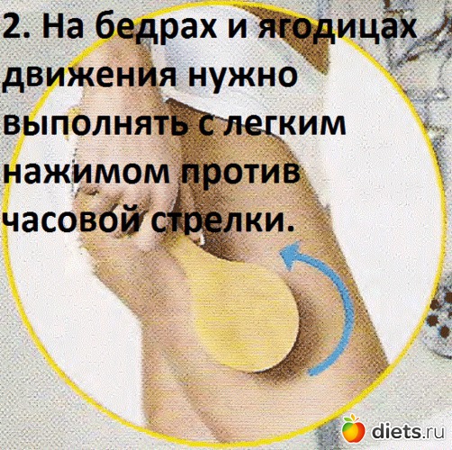 Если вы применяете процедуру растирания исключительно в целях избавления от целлюлита, то вам следует проводить ее именно на проблемных зонах вашего тела. Сила давления на щетку определяется вами. Растирайте заднюю поверхность ног длинными одиночными движениями). Когда перейдете на бедра, выполняйте движения снизу вверх так сильно, как можете, и именно в тех местах, где скопления целлюлита наиболее очевидны. Закончите растирание движениями в области ягодиц во всех направлениях. Сила давления на щетку должна быть не менее мощной, чем на бедрах. Иногда растирания выполняются в направлении от сердца, но в области ягодиц лучше всего выполнять круговые движения.
