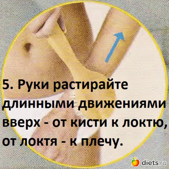 Теперь перейдите на сами руки. Выполняйте растирания длинными движениями от запястья до локтя и от локтя до плеча. Движения всегда должны быть длинными, твердыми и уверенными, и помните: всегда выполняйте движения по направлению к сердцу.