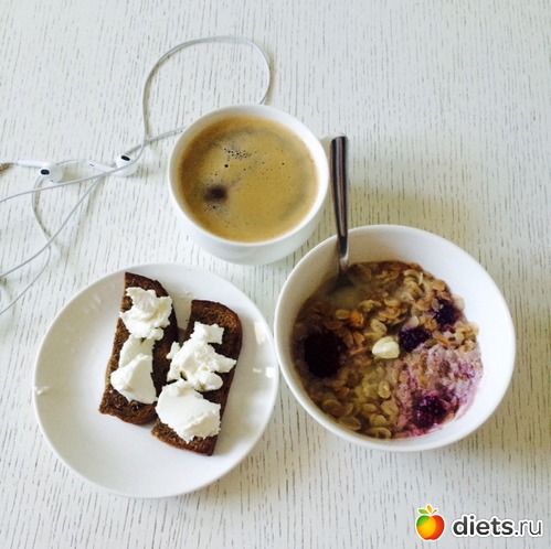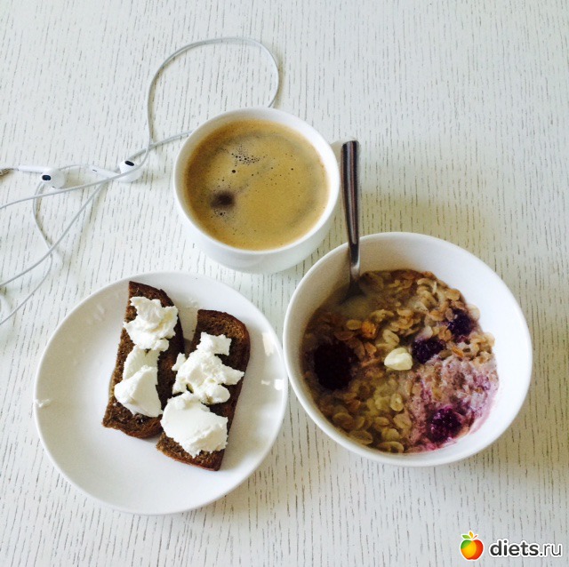 Завтрак: овсяная каша с соевым молоком и черникой, бутерброды с рикоттой, кофе