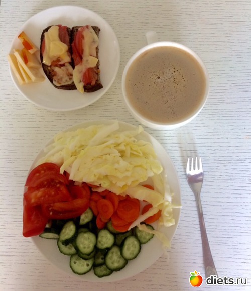 Обед: тарелка овощей, бутерброды с сыром, кофе