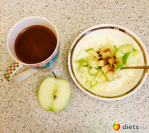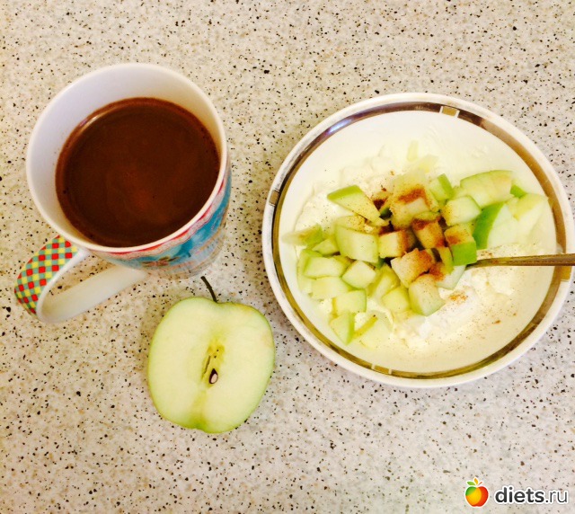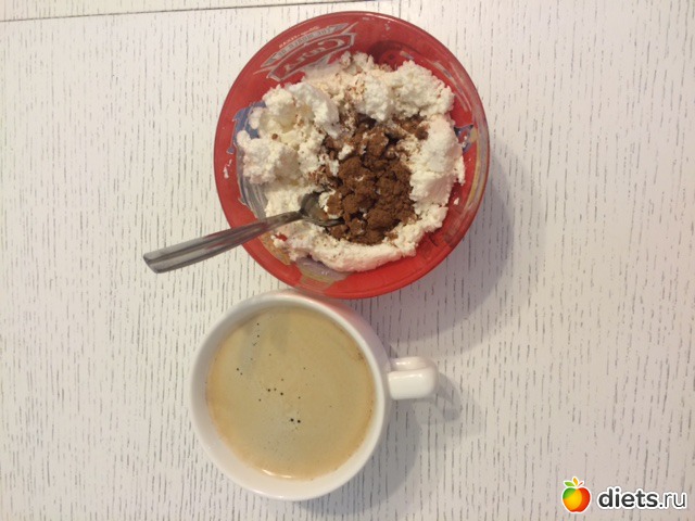Ужин: творог с какао, кофе. Еще сырник сжевала, не успел он на фото...