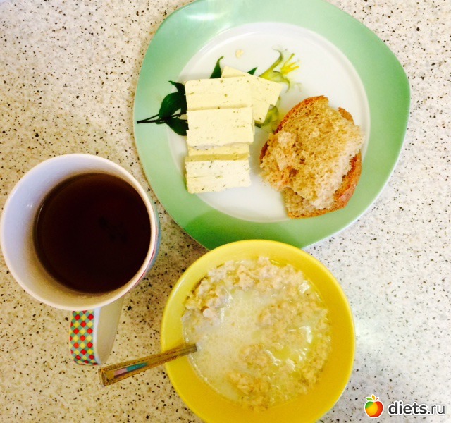 Завтрак: овсяная каша с молоком и оливковым маслом, хлеб, тофу, чай