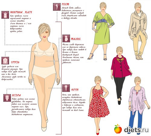 Яблоко. Необходимо носить короткие жакеты, чуть расклешенные юбки, брюки очень идут этому типу. Блузки, футболки без подчеркивания линии талии, заканчивающиеся чуть ниже линии талии. Юбки фасона татьянки (собранные в талии) не подходят.