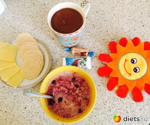 Завтрак: овсянка с молоком и смородиной, хлебцы, сыр, кофе и две конфетки (гостинцы от бабушки