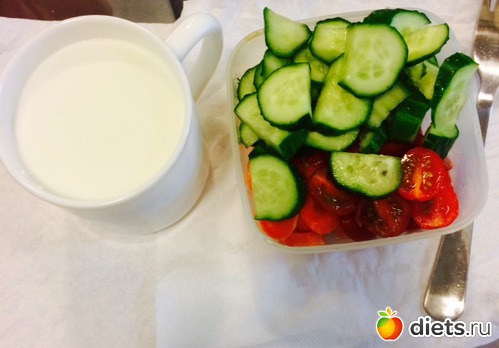 Обед: помидоры, огурцы, морковь внизу спряталась и кефирчик