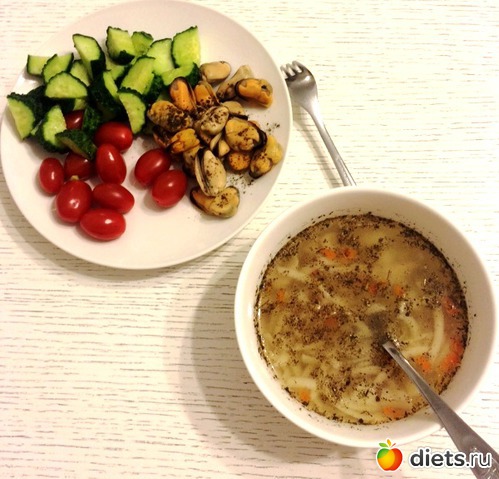 Ужин: лапша куриная диетическая (ну то есть без соли, без зажарки и без картошки), мидии, огурцы, помидоры