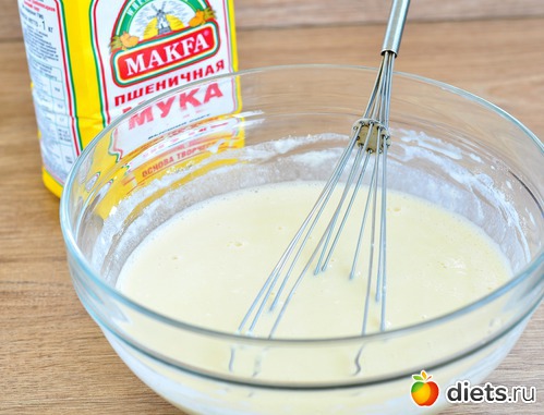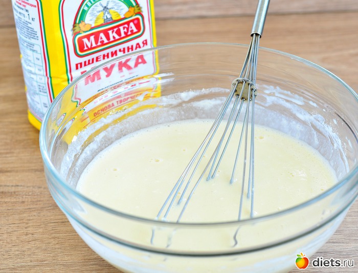 Взбить венчиком сначала жидкие ингредиенты, добавить просеянную муку и разрыхлитель с сахаром и солью. Хорошо размешать чтобы не было комков.
