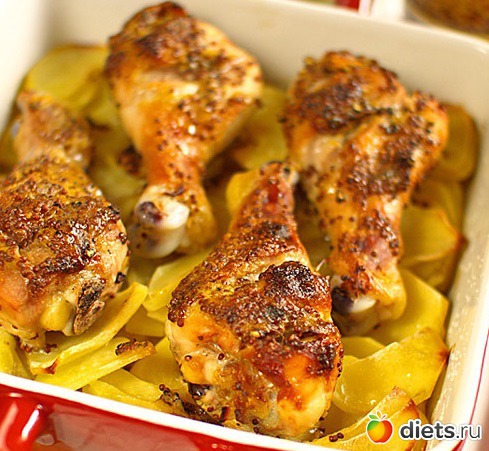 Форму смазываем каплей оливкового масла. Выкладываем картофель (слой не более 5 см.). Солим. На картофель положим курицу. Поливаем оставшимся маринадом. Перчим.
