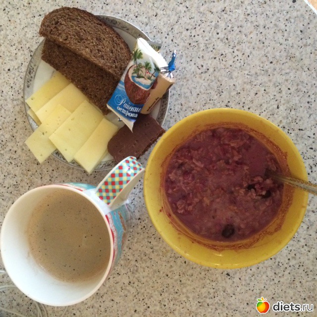 Завтрак: овсянка на миндальном молоке со смородиной, кофе, хлеб, сыр, ну и конфетки (куда ж без них-то...)
