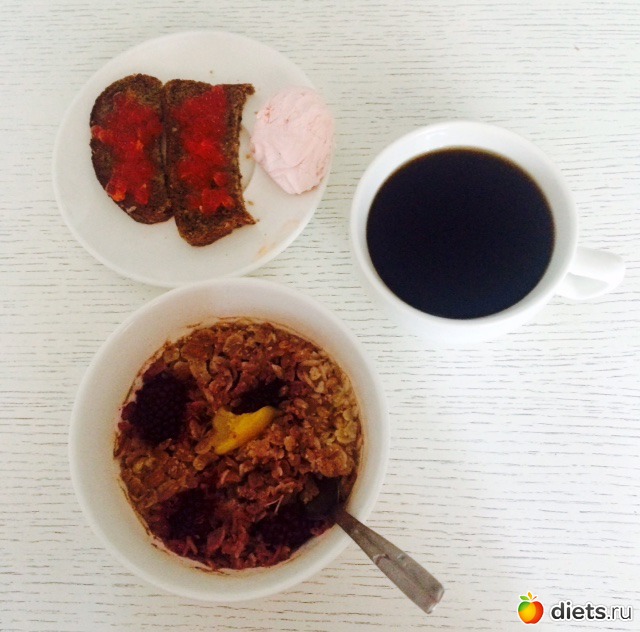 Завтрак: овсянка с ежевикой, бутерброды с икрой, кофе