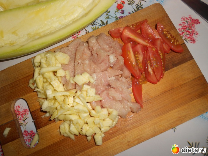 Кабачки нарезать вдоль на 2 половины. Мякоть вынуть, мелко нарезать. Помидоры нарезать кусочками.
