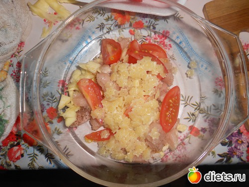 Макаронные изделия "звездочки" отварить в течении 4-5 минут. В миске смешать куриный фарш, нарезанные помидоры, отварные "звездочки", посолить, поперчить.