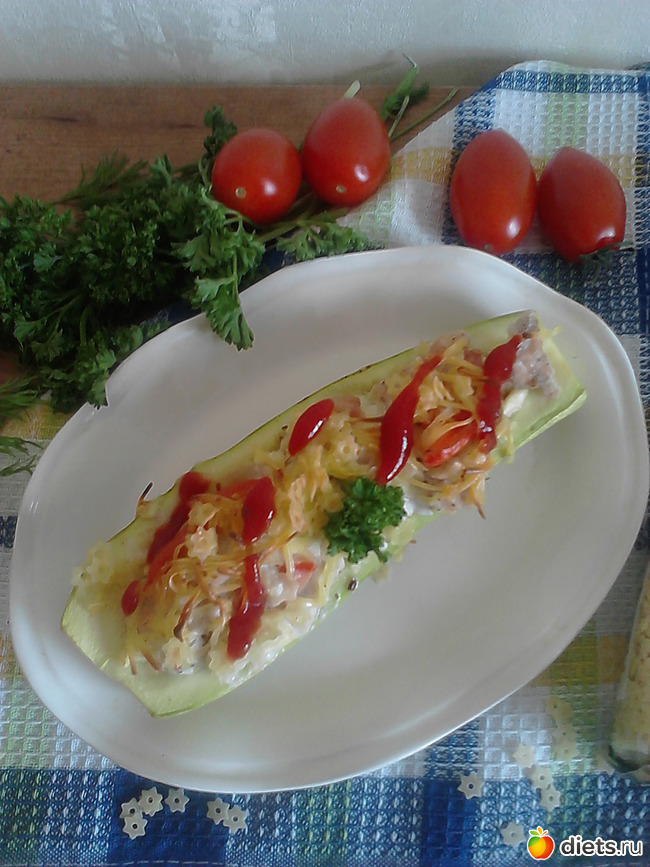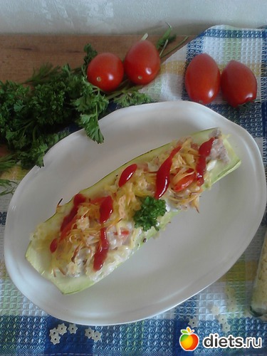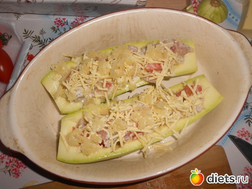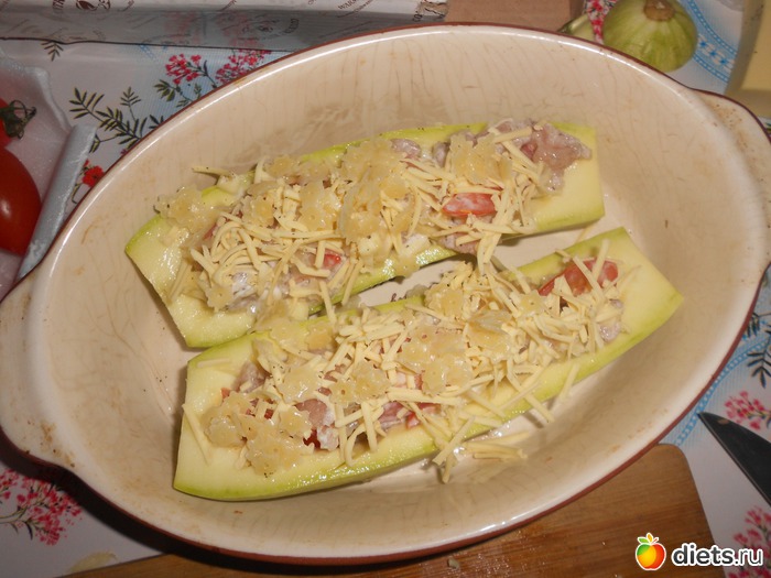 Кабачковые "лодочки" начинить полученной начинкой. Сверху посыпать тертым сыром.