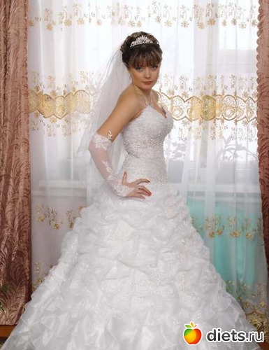Стала я думать об этом платье и решила одеть его сейчас и попробовать поплавать в ванне в этом свадебном платье. Для меня это первый случай будет. Надо бы попробовать. Достала из шкафа свадебное платье. И себя все сняла и осталась в одних трусах. Стала натягивать на себя свадебное платье. Туго его зашнуровывать не стала, чтобы оно мне в ванне не давило. Поверх накинула фату.