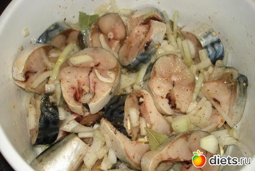 Отрезать хвост и голову, вычистить все внутренности и нарезать тонкими кусочками (замороженную скумбрию намного удобней разделывать, она не разваливается, а все кусочки остаются целенькими).
