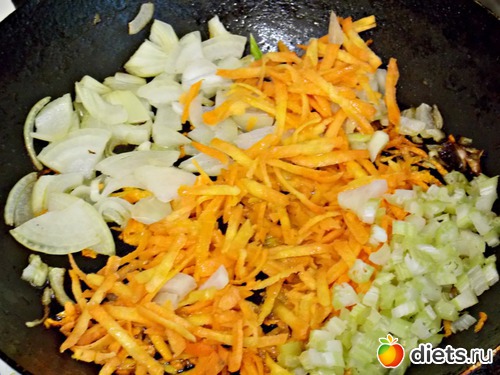 Пока варятся грибы, мы чистим морковь и лук. Моем овощи, морковь трем на крупной терке, сельдерей и лук режем соломкой. Обжариваем на растительном масле до готовности.