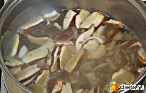 Воду вскипятить, посолить и положить грибы. Можно взять замороженные. Довести до кипения и варить 10 мин.