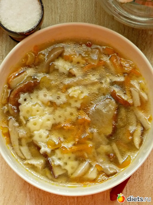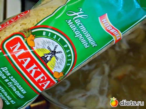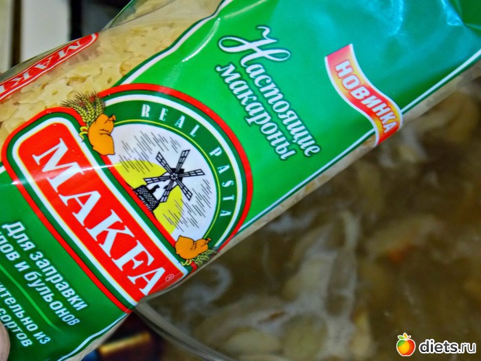 Затем всыпать звездочки "Макфа" в бульон с грибами, кладем зажарку из овощей, перец и лавр.