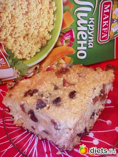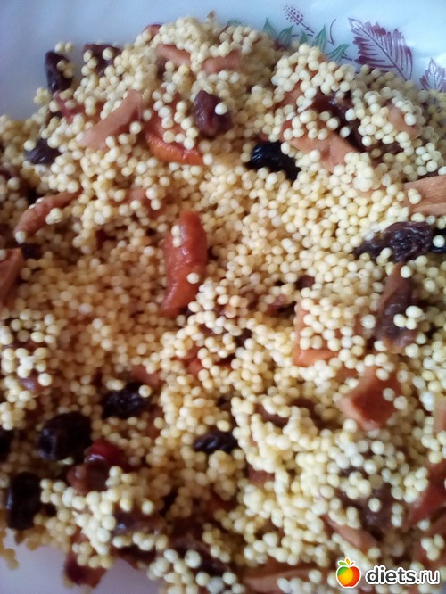 С пшена сливаем воду, отжимаем изюм, курагу, мелко нарезаем, всё смешиваем с пшеном.