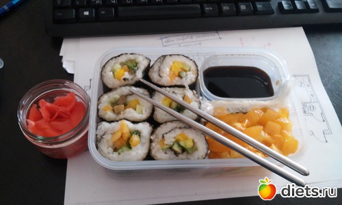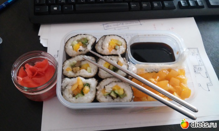 О - роллы с овощами (сама вчера вертела весь вечер)+немного овощей, которые не поместились в роллы+соевый соус и имбирь - решила сделать а-ля японский обед