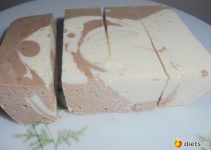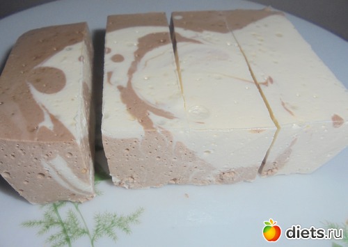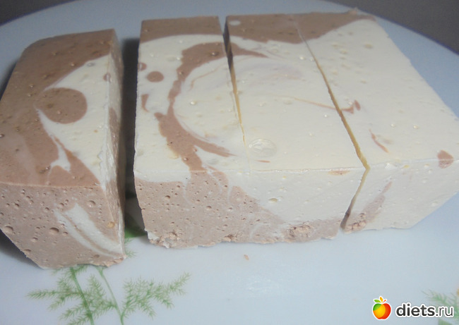 Взбить 100 гр. творога, какао, ванилин, сахзам до однородной массы. Добавить половину подогретого желатина.