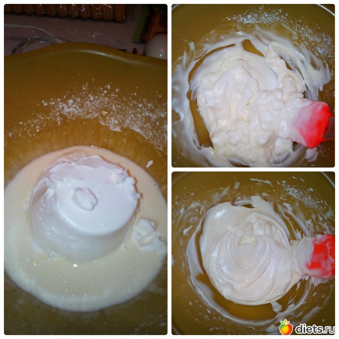 В взбитые белки добавить сыр маскарпоне и все тщательно перемешать, с начало лопаткой, потом до однородности немного помочь миксером